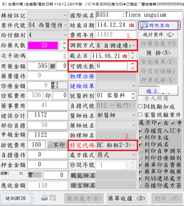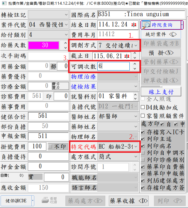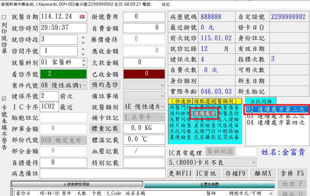 《院內自調》同日第二筆再掛入『08案件』 掛號點選連續處方第二次(IC02),如下圖示