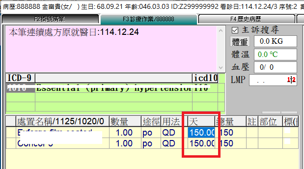 F3診療作業畫面:用藥醫令天數輸入剩餘總領藥日數,例如