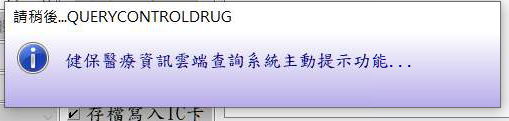 手動查詢:當參數設定「健保醫療資訊雲端查詢系統-跨院重複開立醫囑提示功能 A)自動 Y)詢問 N)關閉」設定值不為「A 」時,則如果開立醫令有符合資料類別13(需查詢之管制用藥)時,會出現如下圖詢問視窗,按『是』一樣執行上圖視窗內容。