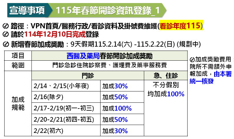 健保署表示,為因應民眾春節9天連續假期有就醫需求,鼓勵西醫基層診所開診,以提高就醫可近性,115年首度利用健保總額之「其他部門」經費擴大獎勵,除夕至初三(2/16~2/19)加成100%,初四及初五(2/20~2/21)則加成50%,小年夜、小年夜前一日及初六(2/14~2/15、2/22)加成30%,期待提升春節假期醫療院所開診率,避免連假期間小病衝大醫院造成之急診壅塞情形。
