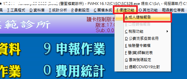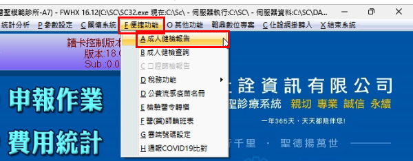 於醫聖主畫面點選系統工具列「F 便捷功能>A 成人健檢報告」進入