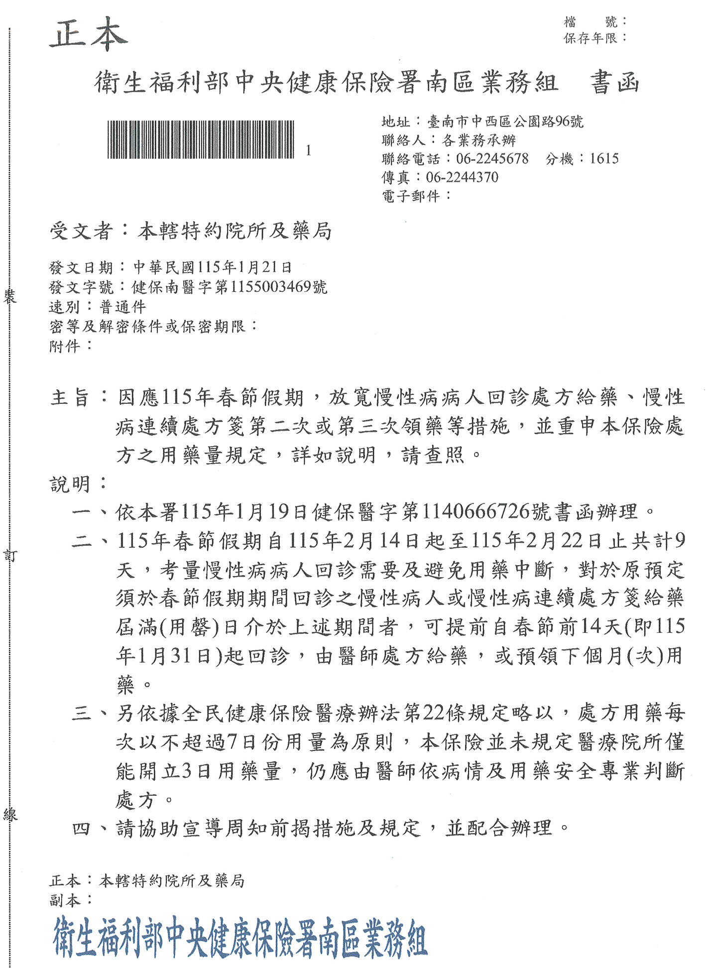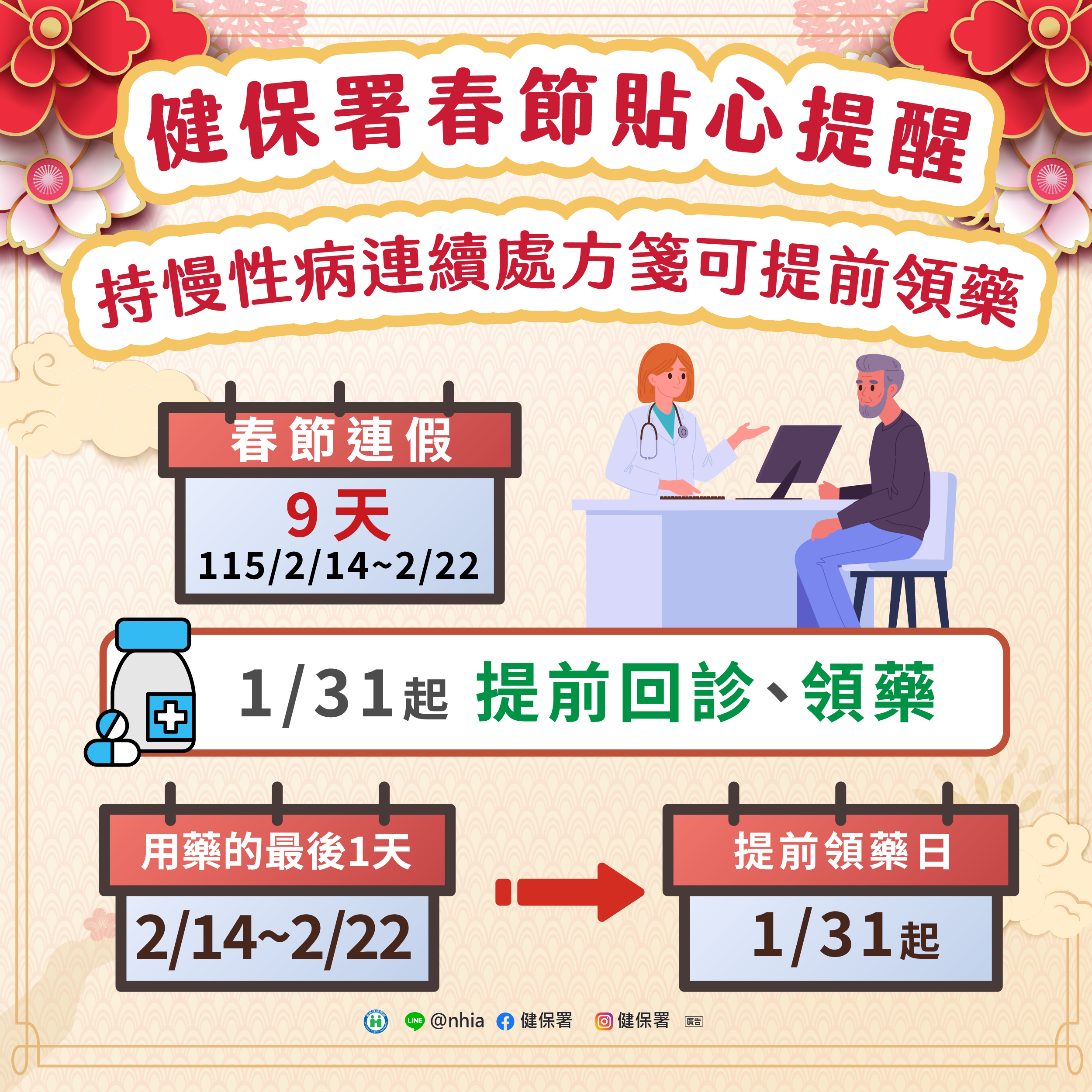 因應115年春節假期,放寬慢性病提前回診處方給藥及慢箋領藥措施