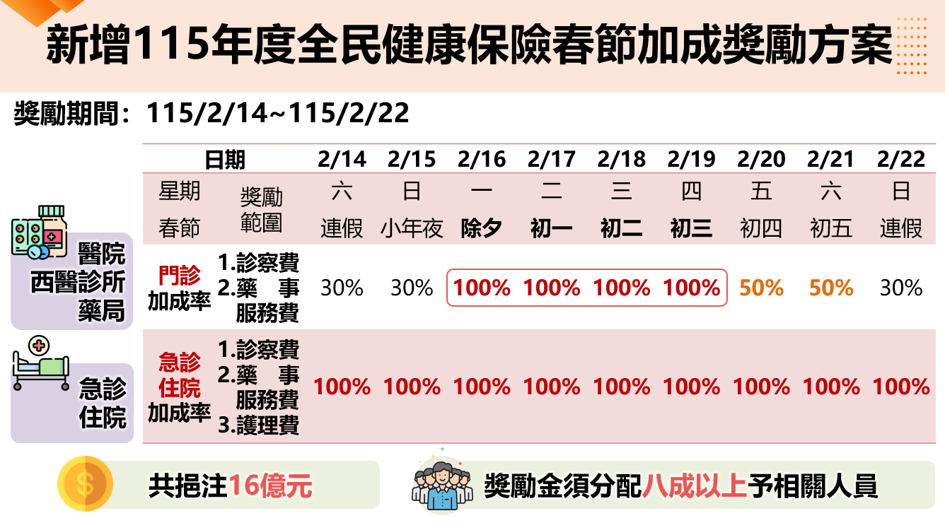 中央健康保險署(下稱健保署)為增進春節假期醫療服務可近性,於115年春節連假9天期間(115年2月14日至2月22日)針對西醫醫院、急診、基層診所及藥局醫事人力費用予以加成,該獎勵方案甫經114年12月24日全民健康保險醫療服務給付項目及支付標準共同擬訂會議討論通過,健保署挹注獎勵費用約16億元,以回饋醫事人員於春節提供民眾醫療服務之辛勞。