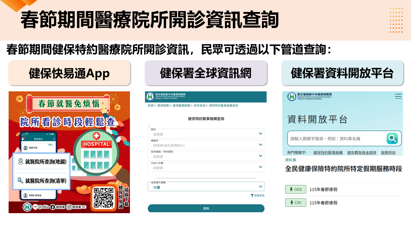 健保署提醒,春節期間民眾若有醫療需求,可透過健保署網站查詢特約院所開診或藥局服務時段資訊(路徑:首頁/健保服務/健保醫療服務/院所查詢/服務時段查詢)點選查詢。另外,民眾亦可透過手機,下載「全民健保行動快易通|健康存摺(APP)」,進入「醫療查詢/就醫院所查詢」輸入關鍵字,地圖將會呈現所在地附近的特約醫療院所或藥局;或點選「進階查詢」,勾選服務時段及其他篩選條件,尋找符合的特約醫療院所及藥局。