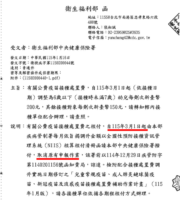 有關115年3月1日起公費疫苗接種處置費及核付方式異動說明