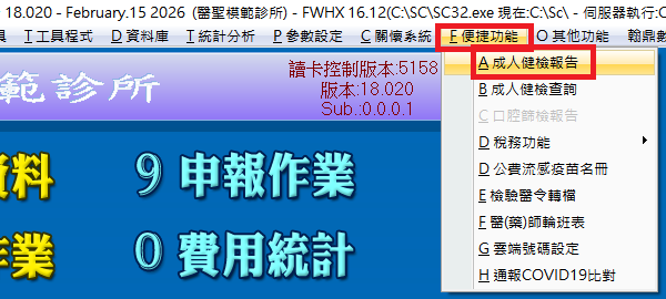 於醫聖主畫面點選系統工具列「F 便捷功能>A 成人健檢報告」進入