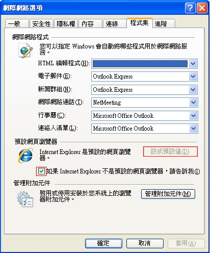 開啟IE瀏覽器→工具→網際網路選項→程式集→點選「設成預設值」及勾選如果IE不為預設瀏覽器出現提醒(如下圖),設定完成按下確定,關閉IE瀏覽器即可 。