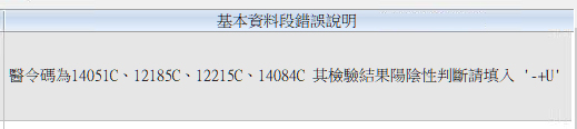 Q:醫令碼為14051C、12185C、12215C、14084C 其檢驗結果陽陰性判斷請填入 '-+U'